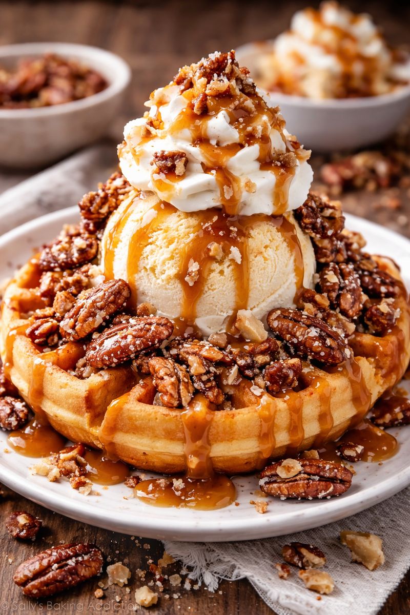 Ułóż gofry na talerzu do serwowania. Na wierzch dodaj sporą gałkę lodów waniliowych. Nałóż na lody ciepłe orzechy pekan w pralinie, pozwalając im wpaść do kieszonek waflowych.