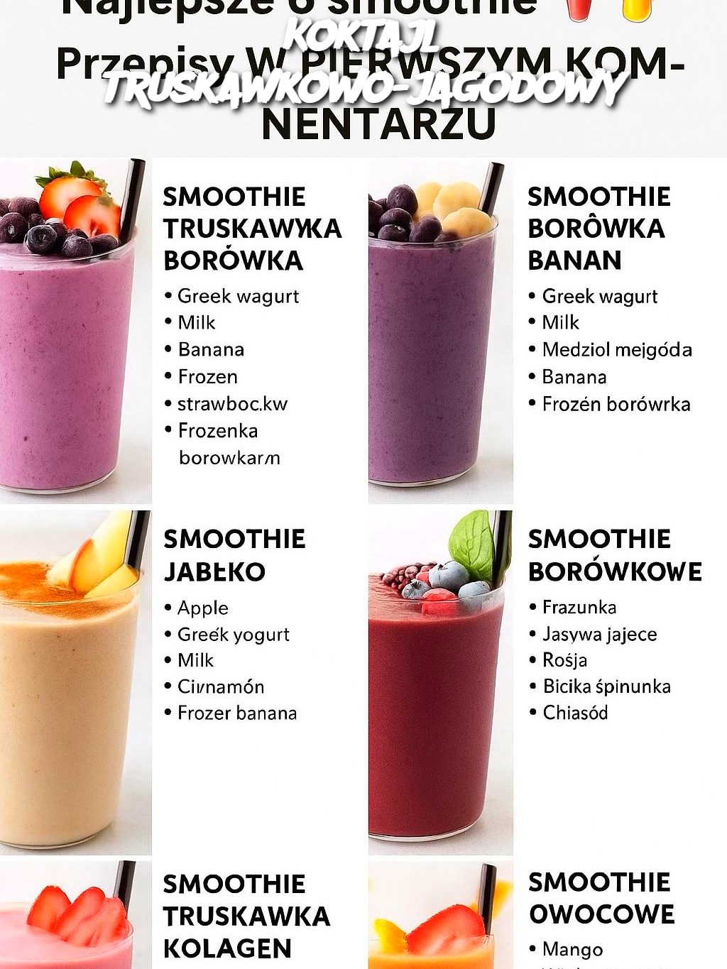 Składniki: 1/2 szklanki jogurtu greckiego 1/2 szklanki mleka (krowiego lub roślinnego) 1 banan (świeży lub mrożony) 1/2 szklanki mrożonych truskawek 1/2 szklanki mrożonych jagód Przygotowanie: Umieść wszystkie składniki w blenderze. Miksuj do uzyskania gładkiej i kremowej konsystencji. W razie potrzeby dodaj więcej mleka. Podawaj schłodzony, opcjonalnie udekorowany świeżymi owocami. Koktajl jagodowo-bananowy Składniki: 1/2 szklanki jogurtu … Read more