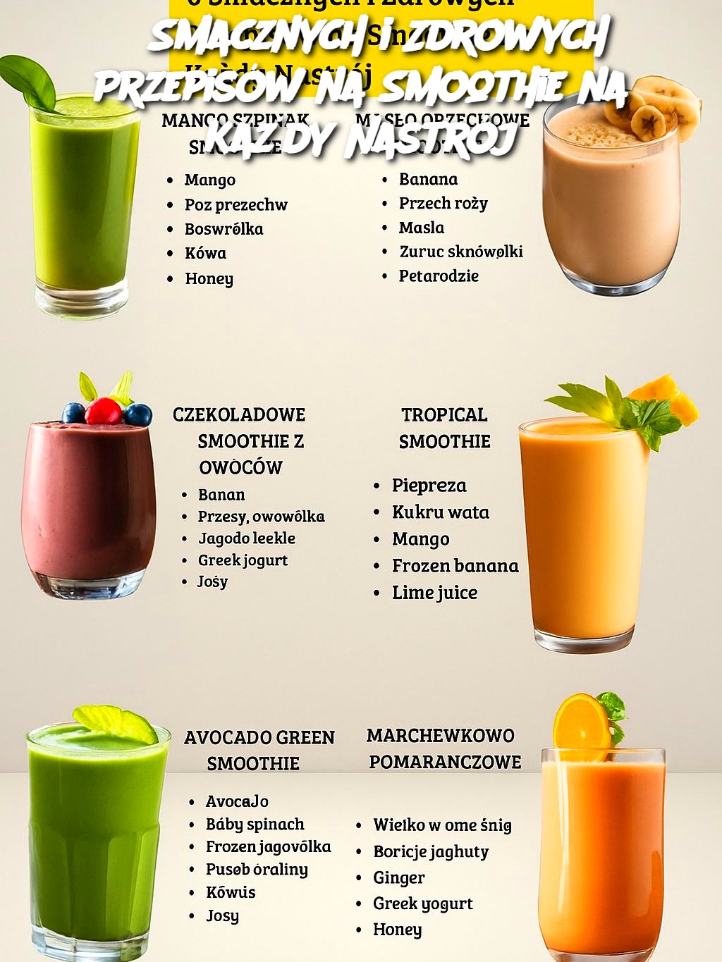 Czy szukasz pomysłu na zdrowy, szybki i pyszny napój? Smoothie to doskonały sposób na dostarczenie organizmowi witamin, błonnika i energii – niezależnie od pory dnia. Oto 6 sprawdzonych przepisów na smoothie, które możesz dopasować do swojego nastroju i potrzeb! 🥭 Mango i Szpinak Smoothie Składniki: Mango Garść świeżego szpinaku Mleko migdałowe Mrożony banan Łyżeczka miodu … Read more