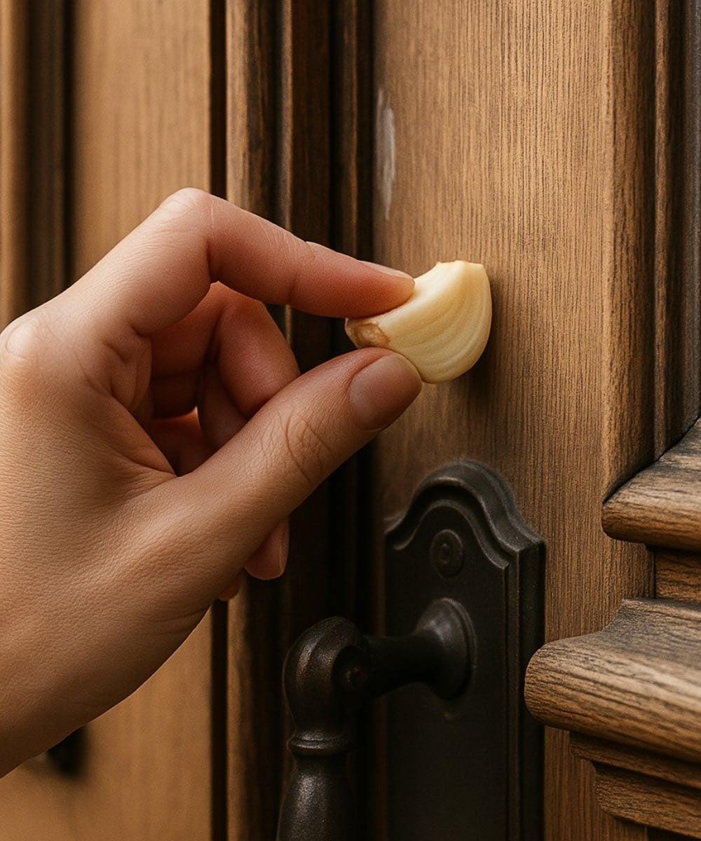 W tym artykule przedstawiono prostą, całkowicie naturalną metodę odstraszania domowych szkodników: pocieranie świeżym ząbkiem czosnku wewnętrznej i zewnętrznej strony framugi drzwi.