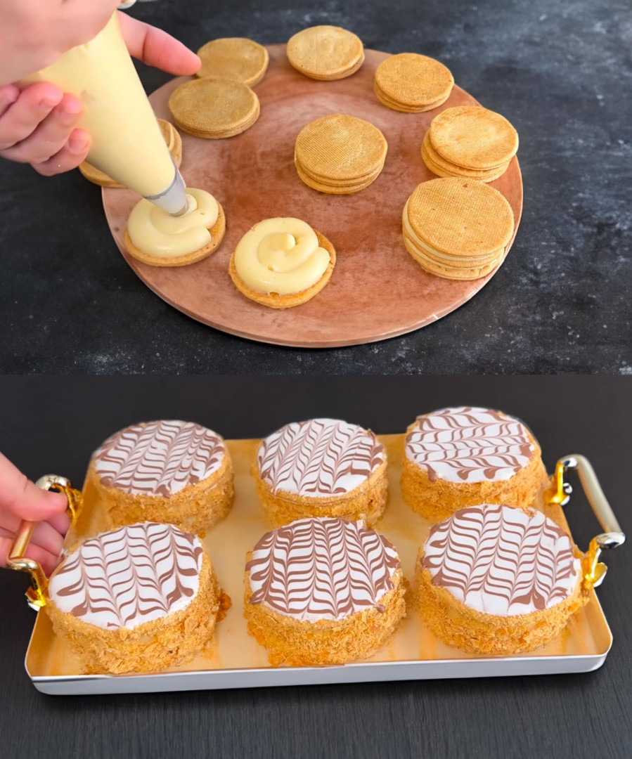 🛒 Składniki (na około 7 porcji) Dla Millefeuille: 2 krążki ciasta francuskiego (gotowego lub domowego). 500 ml pełnego mleka. 4 żółtka. 100 g cukru. 45 g skrobi kukurydzianej (skrobi kukurydzianej). 50 g masła. 1️⃣ Przygotuj ciasto francuskie