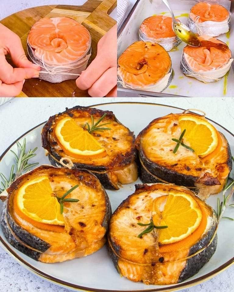 SKŁADNIKI 4 eskalopki z łososia 1/2 pomarańczy (sok) 10 g (1/2 łyżki) miodu 35g (2 łyżki) sos sojowy Oliwa z oliwek z płatkami chili Plasterki pomarańczy rozmaryn Wlać sos: