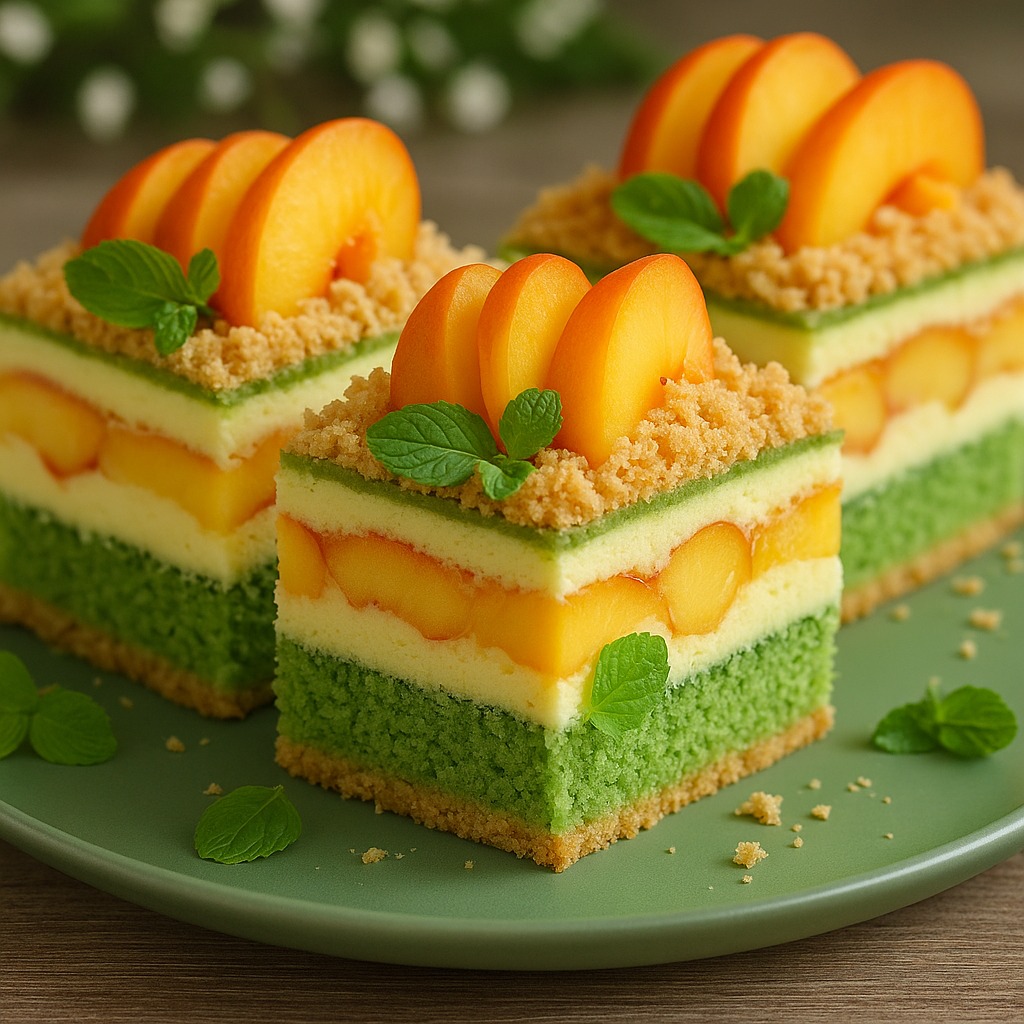 Warstwowe ciasto z brzoskwiniami i zielonym biszkoptem