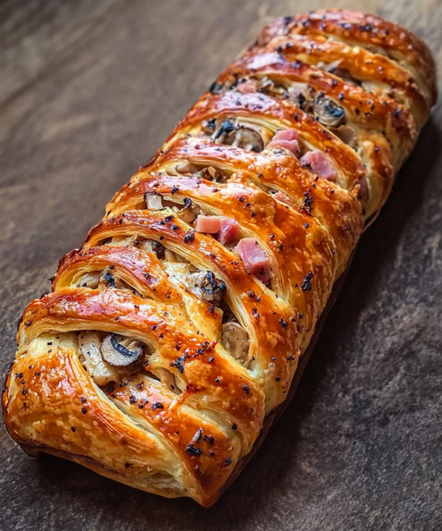 Wyśmienity warkocz z ciasta francuskiego z grzybami, szynką i serem