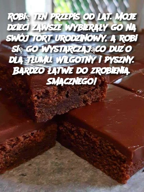Robię ten przepis od lat. Moje dzieci zawsze wybierały go na swój tort urodzinowy, a robi się go wystarczająco dużo dla tłumu. Wilgotny i pyszny. Bardzo łatwe do zrobienia. Smacznego!