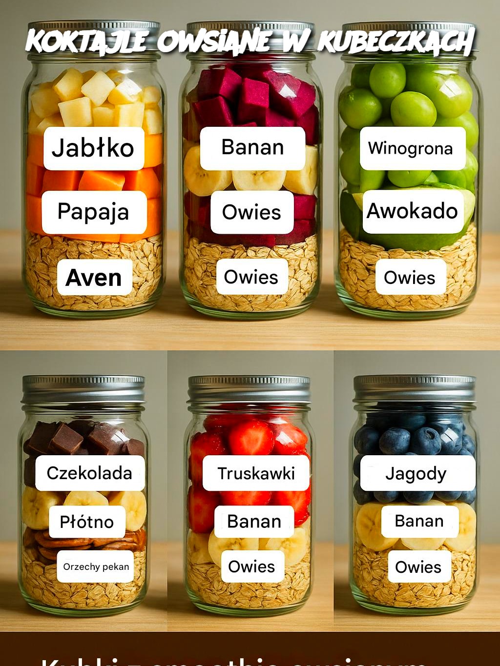Energia, utrata wagi i zdrowe poranki Te piękne koktajle w słoikach typu mason jar są pełne błonnika, przeciwutleniaczy i zdrowych węglowodanów — idealne do przygotowywania posiłków lub śniadań, które można szybko zmiksować. 🍎 1. Koktajl owsiany z jabłkiem i papają Składniki: 1/2 szklanki pokrojonego w kostkę jabłka 1/2 szklanki pokrojonej w kostkę dojrzałej papai 1/3 … Read more