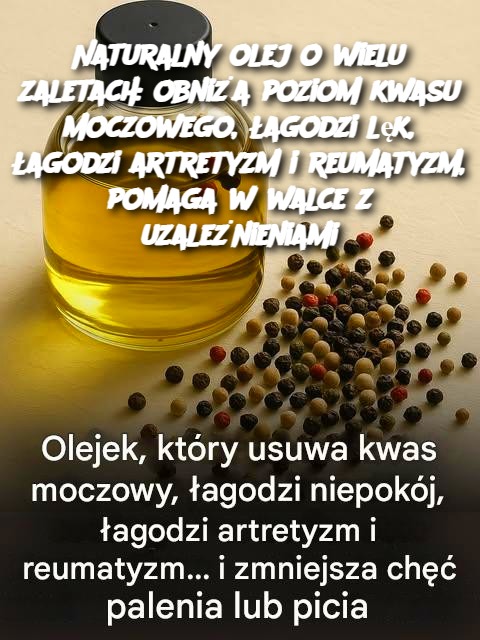 Naturalny olej o wielu zaletach: obniża poziom kwasu moczowego, łagodzi lęk, łagodzi artretyzm i reumatyzm, pomaga w walce z uzależnieniami